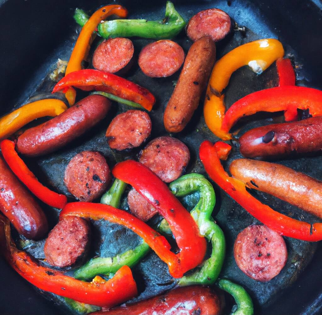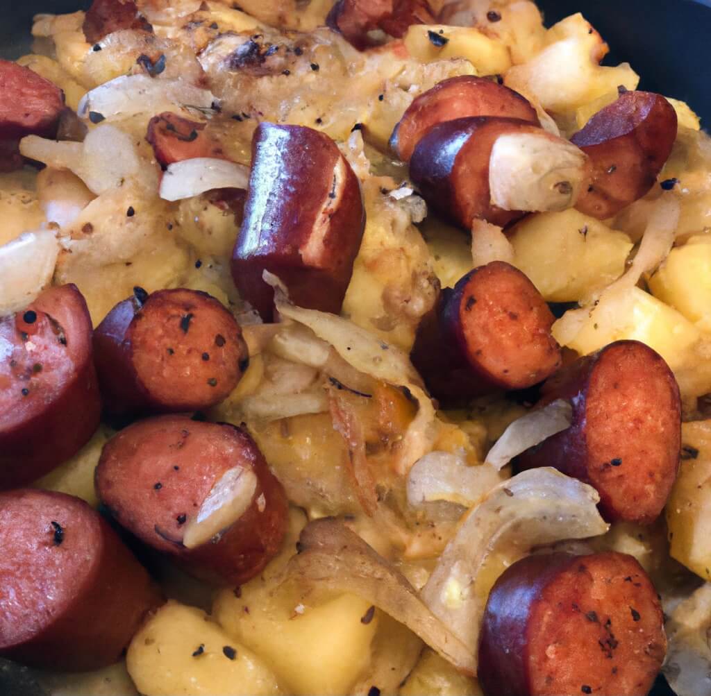 - Add sliced sausage and chopped onions to the pan and fry until the sausage is cooked through.